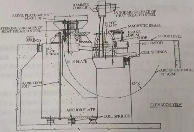 艦船產(chǎn)品一般都具有重量大、體積大的特點(diǎn)。若用規(guī)定脈沖波形的沖擊機(jī)進(jìn)行試驗(yàn),一方面模擬不出爆炸所產(chǎn)生的那種大加速度長(zhǎng)持續(xù)時(shí)間過(guò)程的復(fù)雜沖擊;另一方面,規(guī)定脈沖波形的方法與強(qiáng)碰撞沖擊臺(tái)相比易受負(fù)載(樣品)本身特性的影響。強(qiáng)碰撞沖擊臺(tái)就是針對(duì)受到劇烈的,但又不是毀滅性的爆炸所產(chǎn)生的沖擊影響而設(shè)計(jì)的,如圖6和圖7所示。近年來(lái),由于國(guó)內(nèi)強(qiáng)碰撞沖擊機(jī)少,無(wú)法定量測(cè)量和給出實(shí)際施加的應(yīng)力曲線(xiàn),目前用50 g、30 ms的半正弦沖擊來(lái)代替。