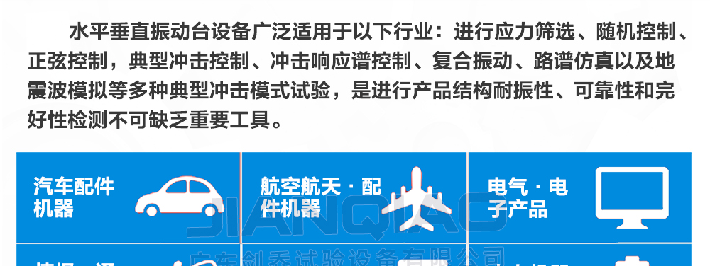 用途:該水平垂直振動(dòng)臺(tái)可模擬再現(xiàn)正弦、隨機(jī)、諧振搜尋與駐留、典型沖擊和道路仿真等模式,符合:(MIL-STD,DIN,ISO,ASTM,IEC,ISTA,GB,GJB,JIS,BS等國家及國際測(cè)試標(biāo)準(zhǔn))